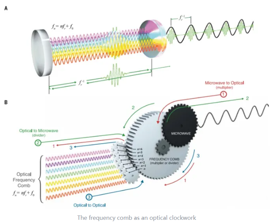 可以将光学频率梳想象成一个非常精确的尺子,这个尺子不是用来测量长度,而是用来测量光的频率。每个“齿”代表一个特定的频率,这些频率间隔是完全均匀的。这种精确性和均匀性使光学频率梳成为非常有用的工具,尤其在需要极高精度的科学和工程领域。